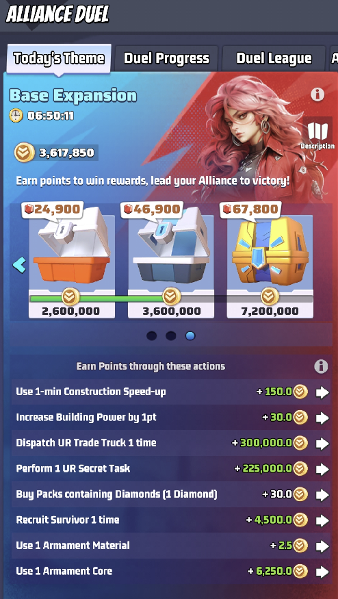 Each required activity during the duel earns you a designated number of points. You can enhance this point yield by conducting research in the “Alliance Duel” section. However, conducting such researches necessitates the use of Valor badges, which, in turn, can only be acquired by opening chests in the duel.