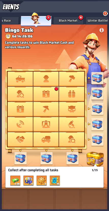 - Additionally, after completing all three tasks in a row, players can open the corresponding chest for that row to receive extra rewards. The same applies after completing all five tasks in a column.
