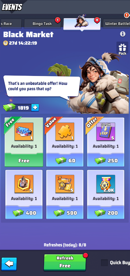 Every day you will be able to do 8 refreshes of the market and access its offers. The first daily refresh is for free, the others cost 10 diamonds.