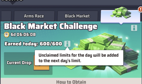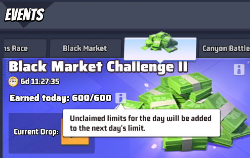 As usual you have a max amount of Black Market Cash that can be dropped during the day. Unclaimed limits for the day will be added to the next day’s limit.