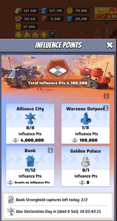 Gain 5 M Influence Points from capturing Cities in other warzones