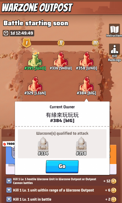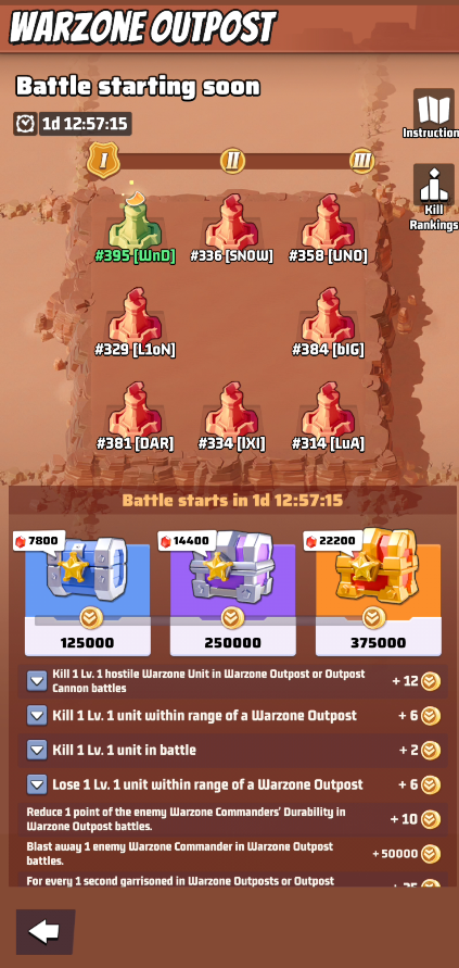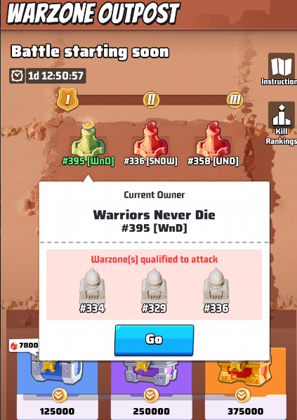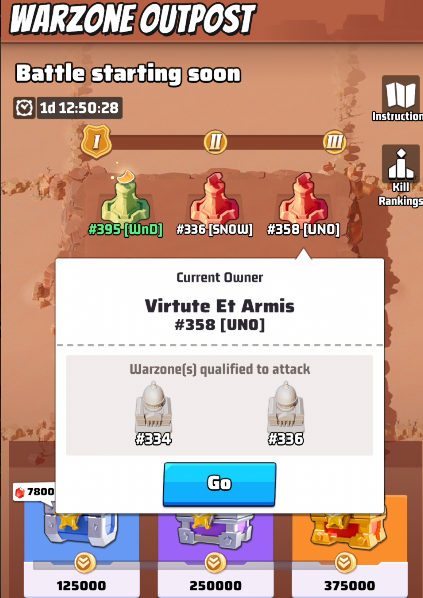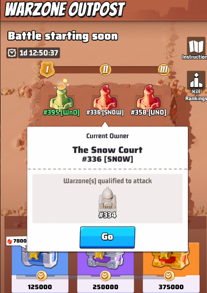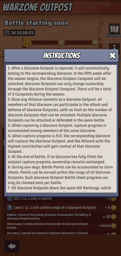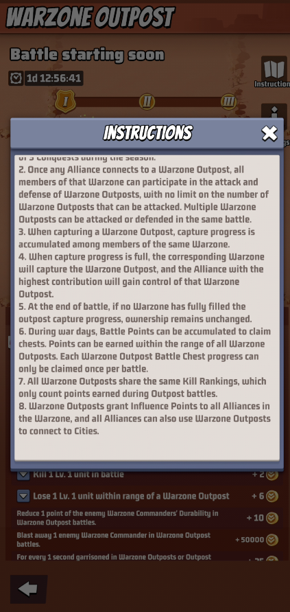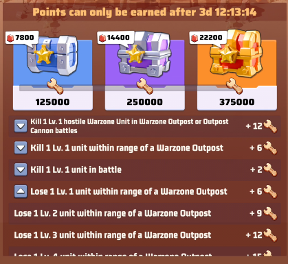 - During war days, Battle Points can be accumulated to claim chests. Points can be earned within the range of all Warzone Outposts, Each Warzone Outpost Battle Chest progress can only be claimed once per battle.