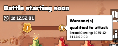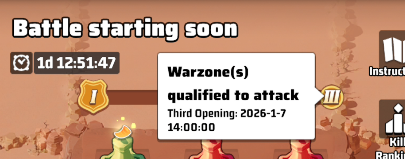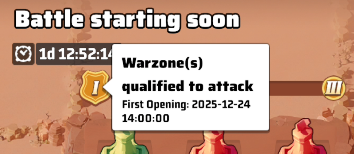 - There are 3 battle time slots during the whole season, they happen on Fridays at 11:00 server time.