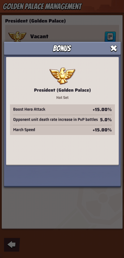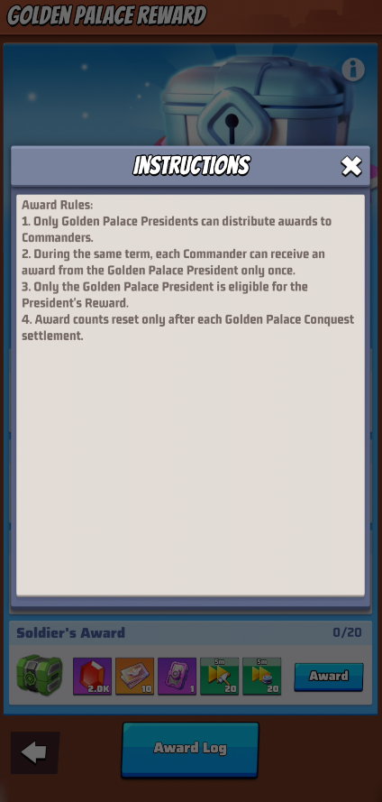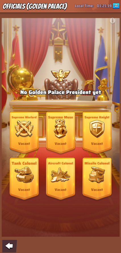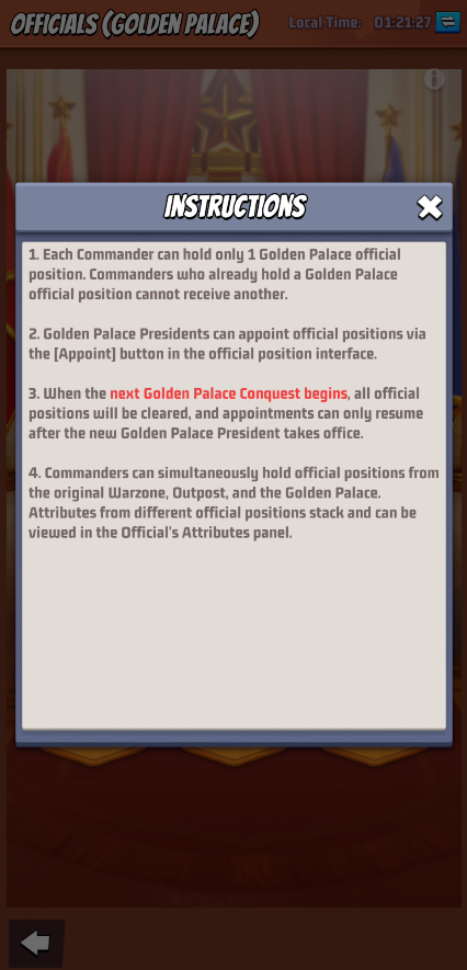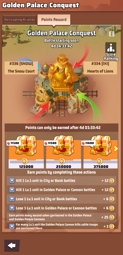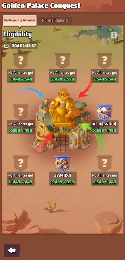 - During the event, every Saturday at 13:00 server time, Alliances whose territory connects to the Golden Palace may take part in capturing the Golden Palace.