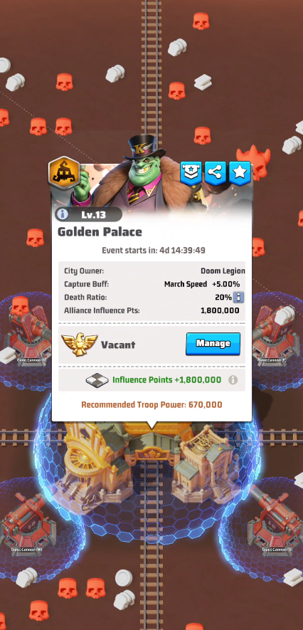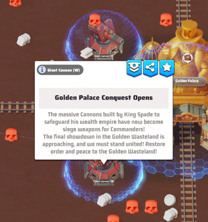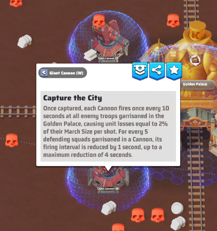 - Controlling a Cannon grants different effects: if your Alliance controls the Golden Palace, the Mega Cannon boosts your Alliance’s capture speed. If nat, the Cannon will automatically attack the garrisoned units inside the Golden Palace.