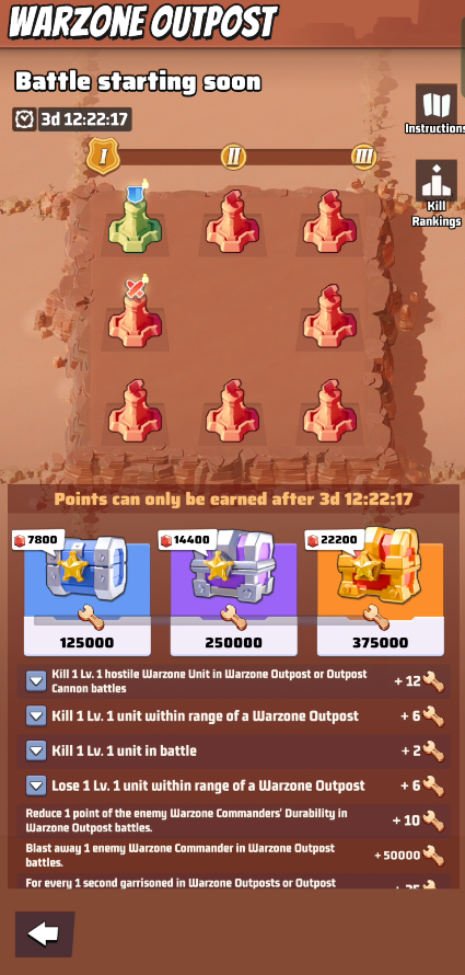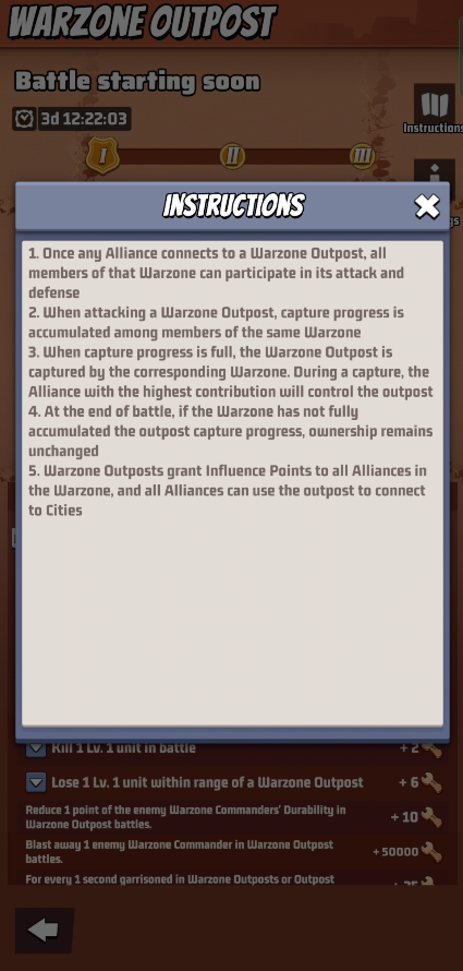 - When capture progress is full, the Warzone Outpost is captured by the corresponding Warzone. During a capture, the Alliance with the highest contribution will control the outpost 4. At the end of battle, if the Warzone has not fully accumulated the outpost capture progress, ownership remains unchanged