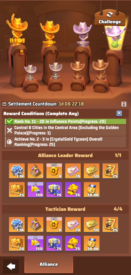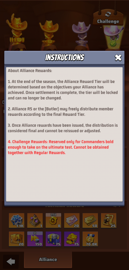- Challenge Rewards, that are new types of rewards but they can be obtained by only few alliances that meet some very challenging conditions. These rewards are an alternative to the Regular Season Alliance Rewards, they cannot be obtained together.