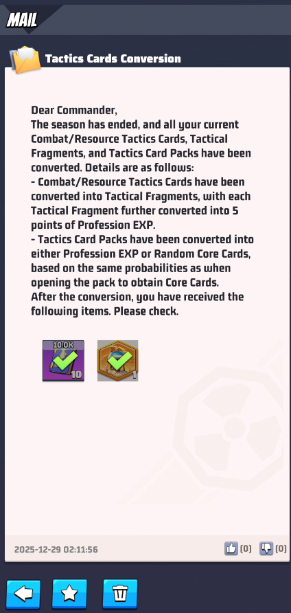 - Tactics Cards battle and resource slots will be closed and battle and resource cards will not be visible any more. All your tactics battle and resource cards will be converted