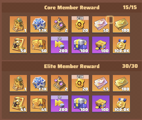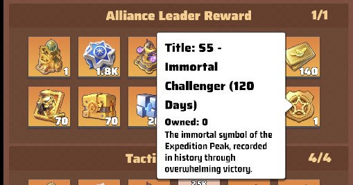 For reference find below the top tier of Alliance and Challenge rewards: