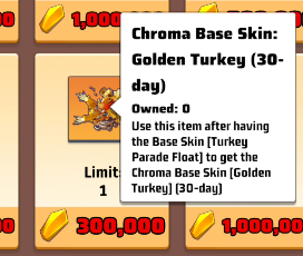 Season 5 features Turkey Parade Float as base skin with seasonal boosts (check out here the details), it can be purchased in the Cosmetics store (~400$).