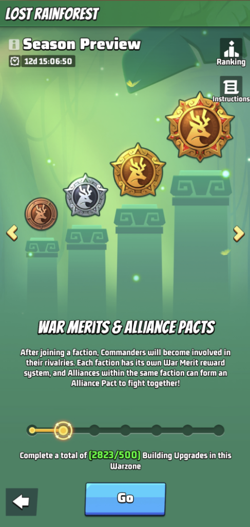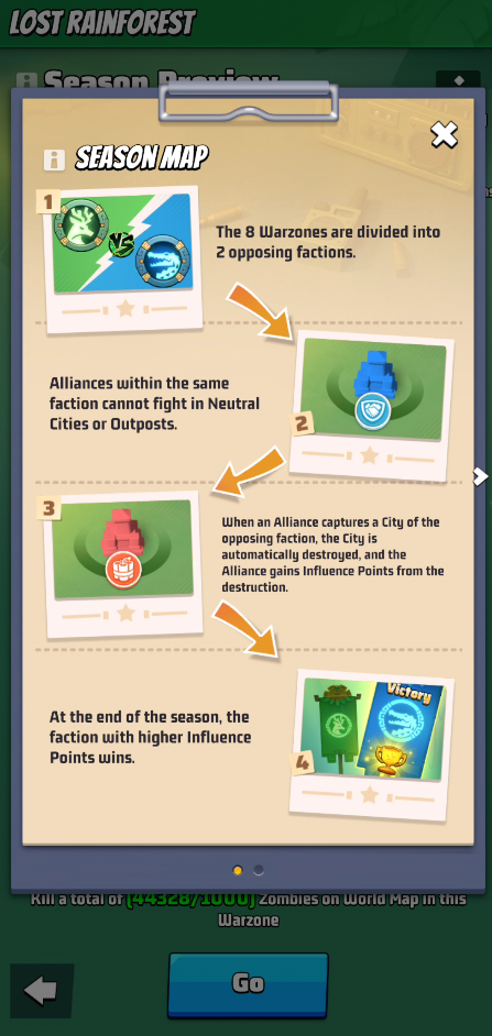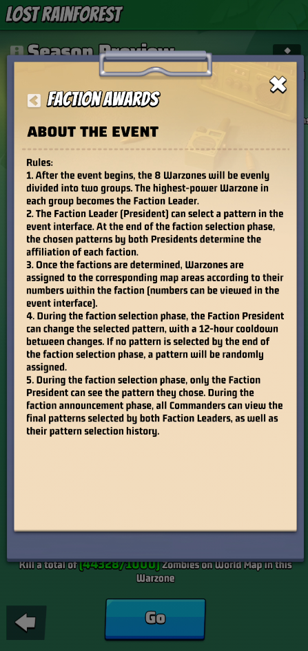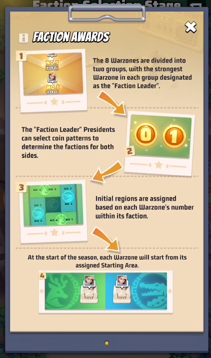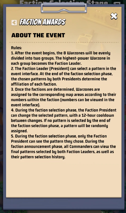 - After the event begins, the 8 Warzones will be evenly divided into two groups. The highest-power Warzone in each group becomes the Faction Leader.