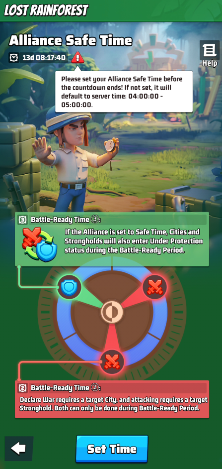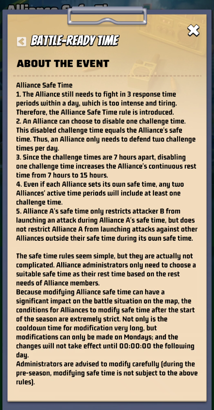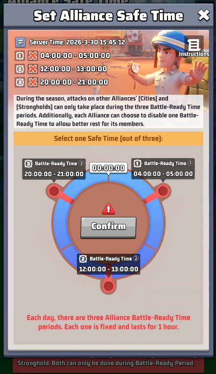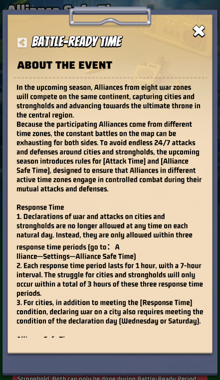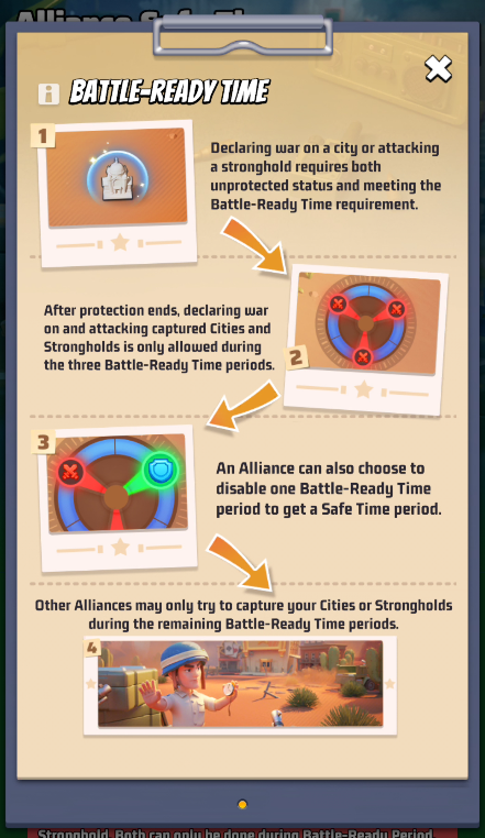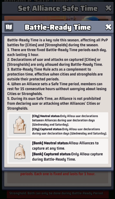 You can choose which slot of battle will be your Alliance Safe Time, during which your Cities and Strongholds CANNOT be attacked.