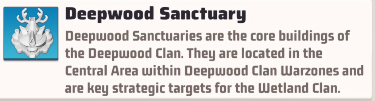 Deepwood Sanctuaries are the core buildings of the Deepwood Clan. They are located in the Central Area within Deepwood Clan Warzones and are key strategic targets for the Wetland Clan.