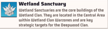 Wetland Sanctuaries are the core buildings of the Wetland Clan. They are located in the Central Area within Wetland Clan Warzones and are key strategic targets for the Deepwood Clan.