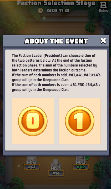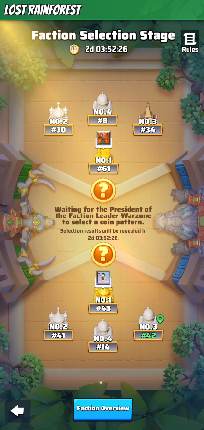 - The Faction Leader (President) can select a pattern in the event interface. At the end of the faction selection phase, the chosen patterns by both Presidents determine the affiliation of each faction.