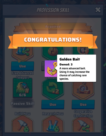 - Golden Bait: this skill is very useful and its cooldown is only 23.5h, so I suggest you take advantage of it to capture better fish