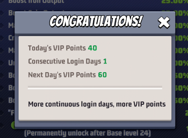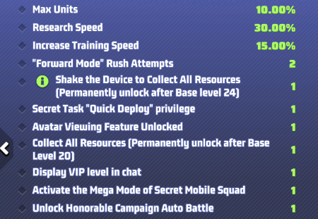Progression to higher levels necessitates the accumulation of VIP points, which in turn unlocks potentially increasingly substantial buffs (you still need to activate your VIP status to use them). Each level requires a higher amount of VIP points to be unlocked.