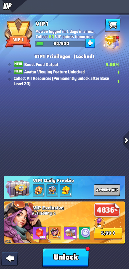 In fact, in this image you can see that your VIP1 privileges are Locked, and the game allows you to unlock them clicking on the button “UNLOCK” at the bottom.