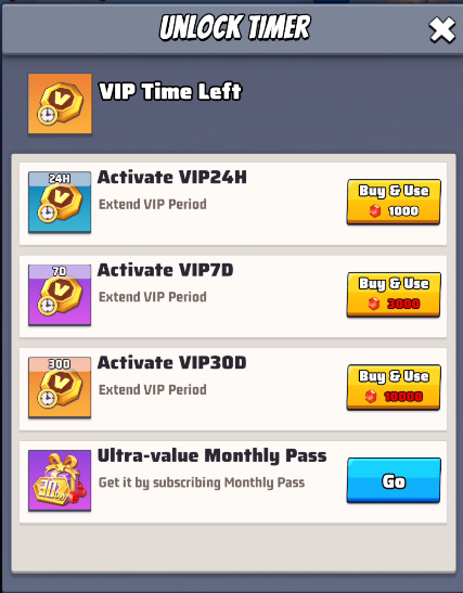 - Clicking on the countdown button you can purchase additional VIP time.