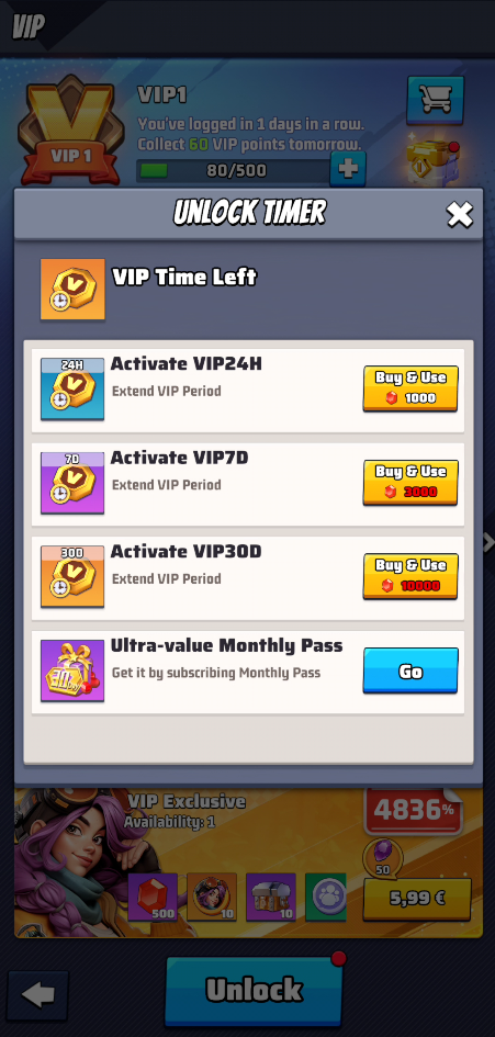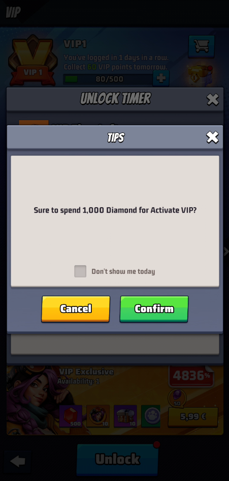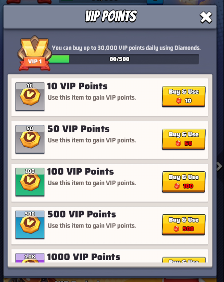 - purchase additional VIP Points spending diamonds.