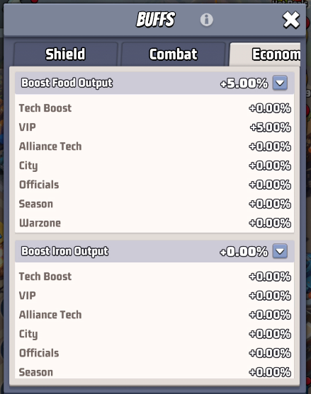Since our VIP status is not active, the privilege of Boost Food Output +5%, that is part of the VIP1 privileges, is not active either.