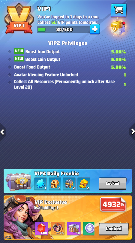 - Use free VIP chests daily: Never forget to claim your daily golden and blue VIP chests — they provide free items and VIP points that accumulate over time.