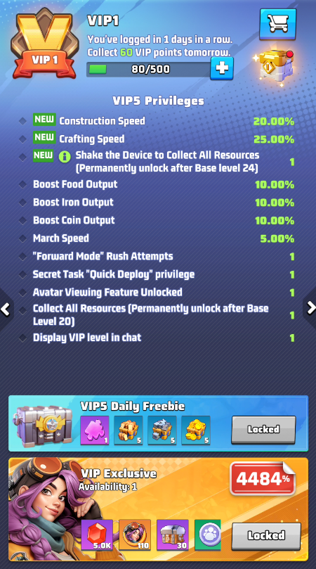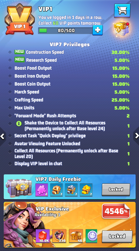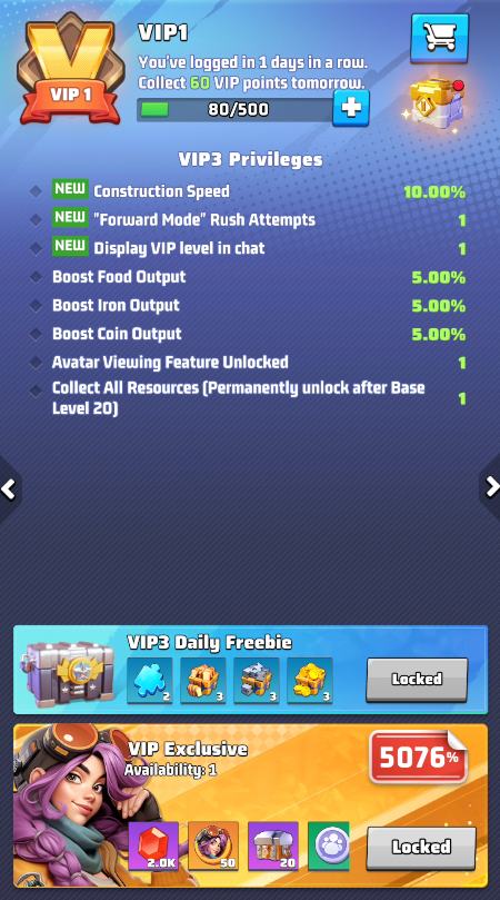The VIP Program is a progression system that provides permanent level progression and temporary activation bonuses. Each VIP level unlocks increasingly powerful benefits such as construction speed boosts, research speed improvements, and exclusive rewards.