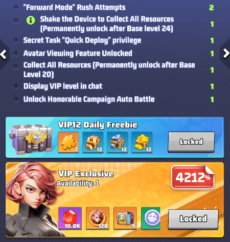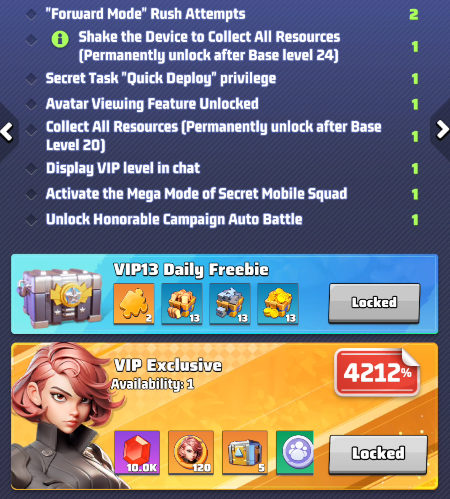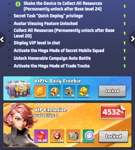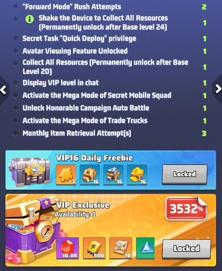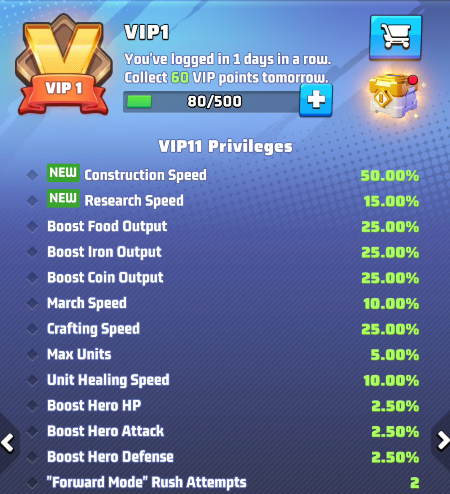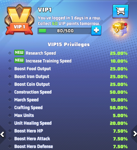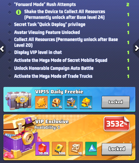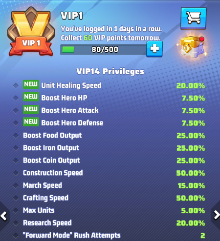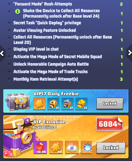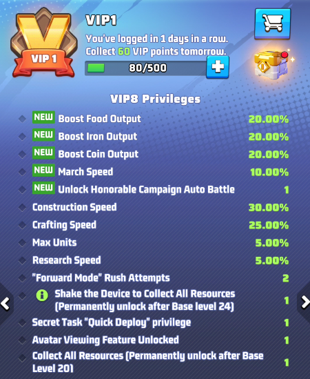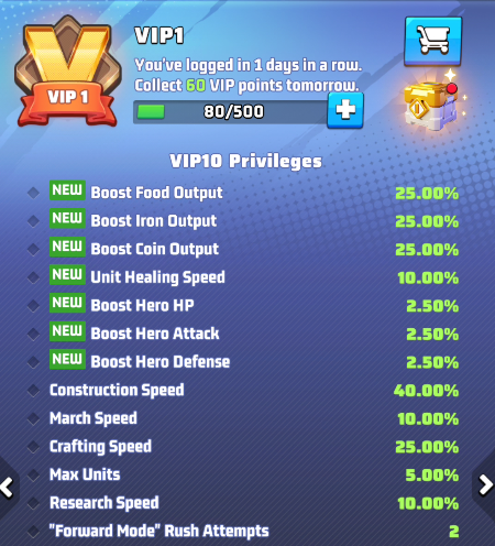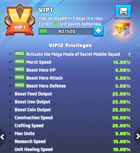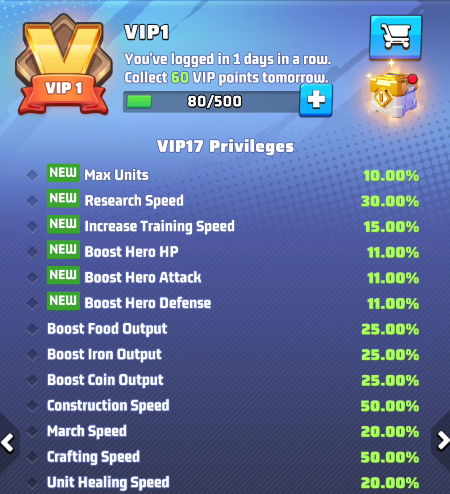- the selected VIP level and its perks. Use arrows to move between level and preview the perks of other levels. IMPORTANT: these buffs are active only if your VIP status is active.
