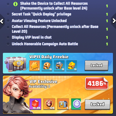 - Time your VIP point purchases: If you’re close to leveling up your VIP, wait until you can trigger the free 1-hour VIP time bonus — it’s a helpful trick for early‑game efficiency.